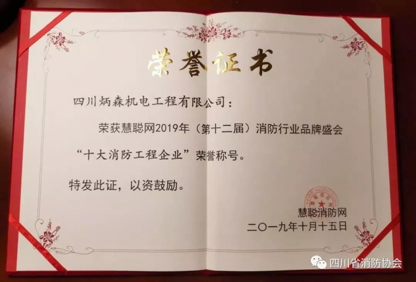恭喜四川省消防協會常務理事單位-炳森連續榮獲CFIC2019十大消防工程企業!